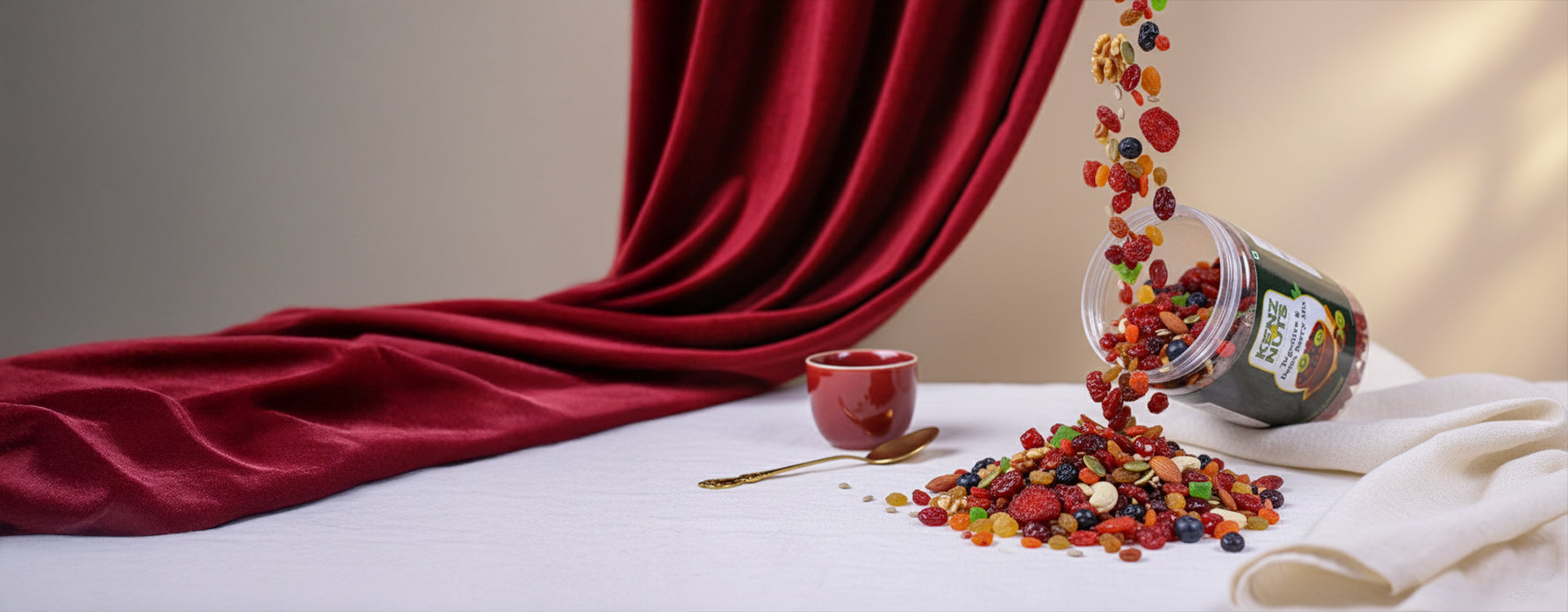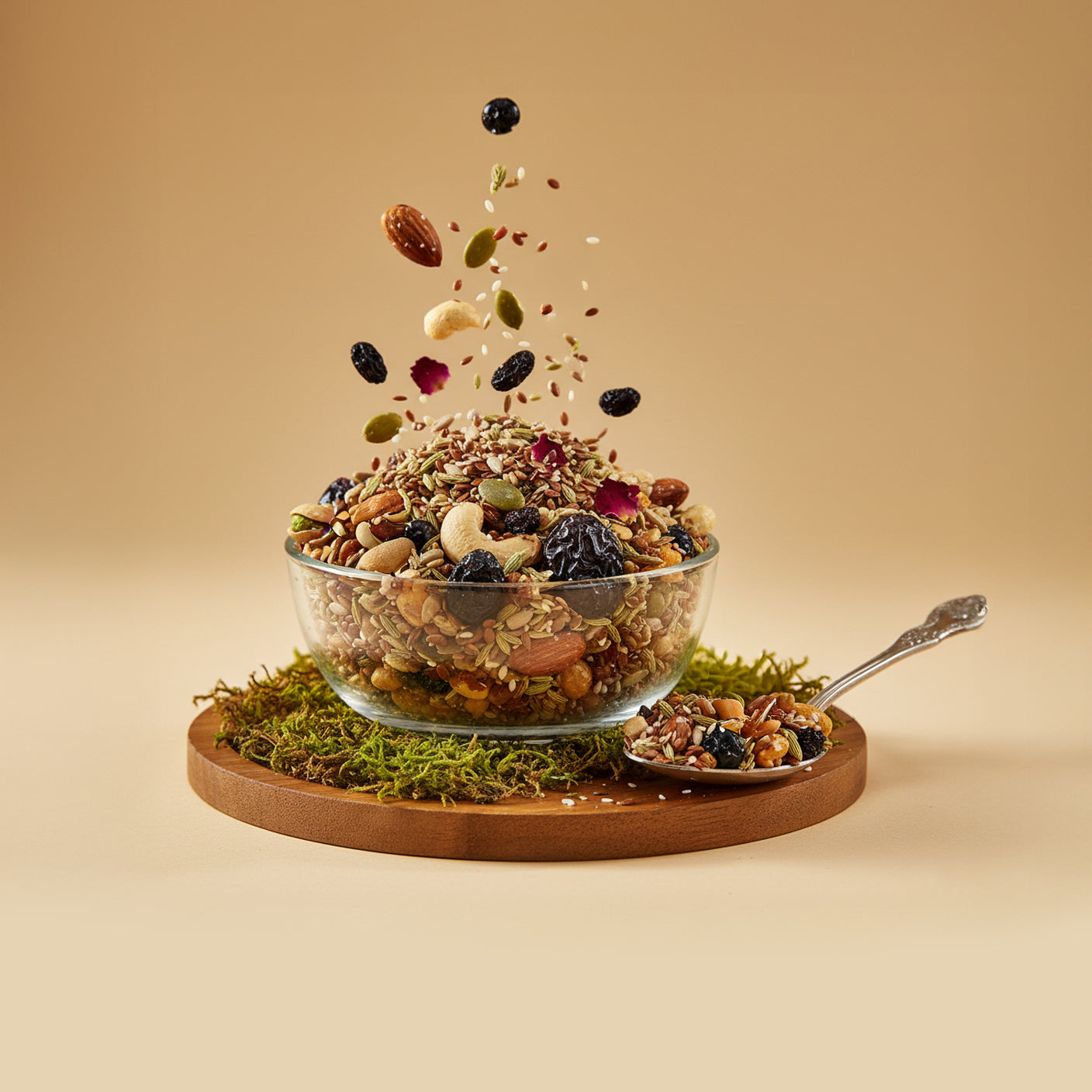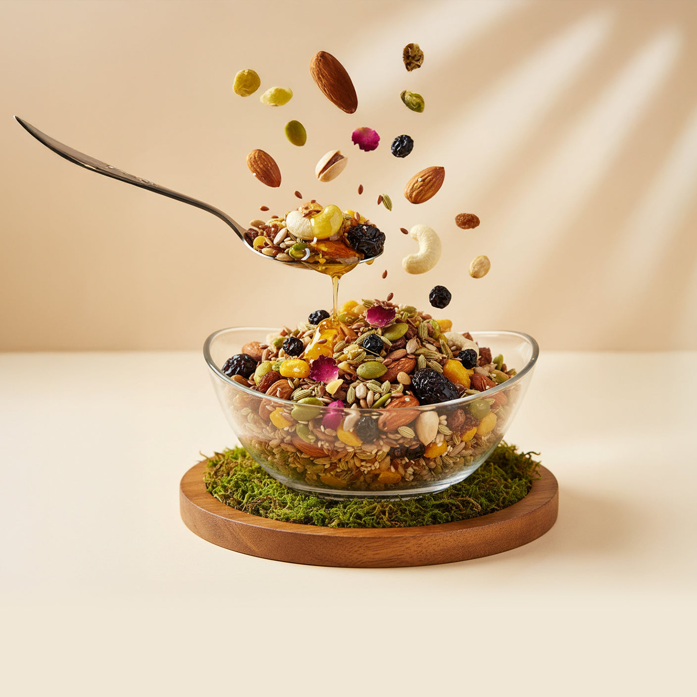 A perfectly balanced roasted mix of premium nuts and seeds, lightly salted with Himalayan pink salt and Kala Namak for everyday energy and crunch.